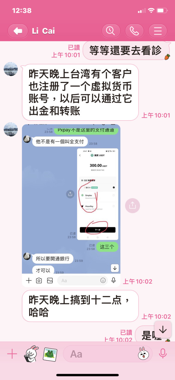去年10月初投資美金程式打不開,分析師說公司怕我自己操作把錢輸光,他們該賺得錢就無法拿到,10月中旬我操作台有七萬多美金虛擬貨幣,要求出金,稅金,換線路的錢,政府公證的錢,我都付清,結果分析師說,客服那裡出狀況,無法出金,叫我等,後來又說可以出金,又沒出金,反反覆覆又教我下載交易所,匯給處理資金人員的紅包錢,分析師一直跟我在賴都有聯絡,還說他說,我是他的客戶,他會負責到底,不會吃掉我的錢,不然他封鎖我就好了,為什麼還要跟我賴,於是經過交易所也換美金虛擬幣匯給分析師四次,今年4月17號是最後一次匯美金虛擬貨幣,分析師還說放心會馬上處理,4月18號我的賴就沒有讀,我賴電也不接,真是可惡,我辛辛苦苦賺的錢也都被他騙走了,人在做,天在看,會有報應的