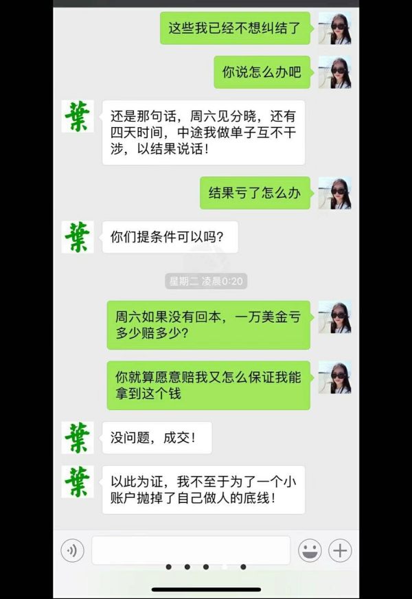 周二说的好好的,我帮忙打理账户,中途不得干涉账户,周六验收结果,差多少补多少;然而周四删了我三单镑美、镑日(2.5手高位的空单和2手低位的多单),损失3000刀左右,周五又动单子,纳斯达克空单不出也够一万多美金。谁违约在先?有图有真相,不必过多的解释!!