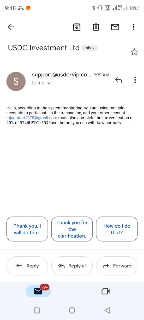 Sir/madam, My usdc account was normally traded by me and thought out before two months and from invite freind option I had invited my friend and we both had done verification process before being registered and then we start trading by suggesting each other because my friend didn't know so much English language so much I had helped him some time. In trade and some time I got so much loss and i invested more money by taking loan and all . But now usdc has freeze our account by saying That i have to do tax verification then I had done this verification by recharging of usdt 20% of amount which I have in account after that they stopped my withdrawal process and then company again ask for 10% of deposit in my account to have normally withdraw otherwise they freeze my account also they are saying some abnormal behaviour seen ,but I want to ask that what behaviour I had done wrong give explanation about that .I have lost my all money in this ,now i have to go cyber police and I have no option left Please take proper action, otherwise I have to take action against company. I have all proof some of my I'd and I am ready to verification of my identity Thank you support@usdc-vip.com named company has scammed me by taking me in trade then asking for money again and again,they had freeze my account and I am not able to withdraw my money back,they blame me for abnormal behaviour and ask for money to unfreeze my account for withdraw, they ask for money to deposit in my account in the name of tax verification process which I had done 20% of amount in my earnings by traded amount
