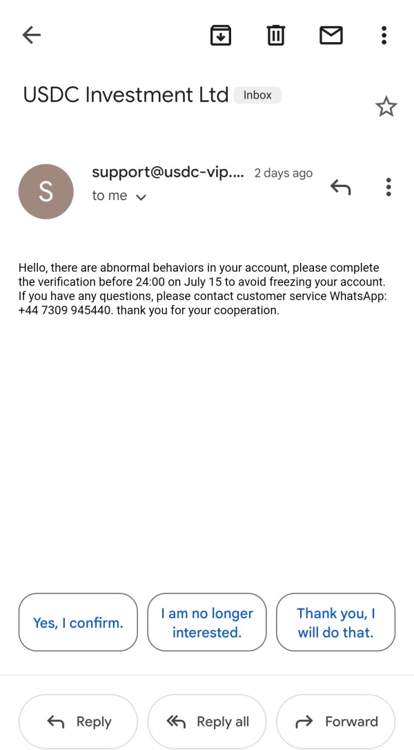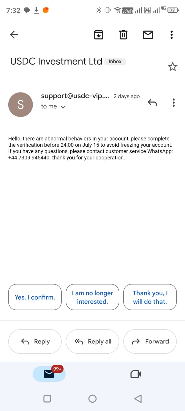 But now usdc has freeze our account by saying That i have to do tax verification then I had done this verification by recharging of usdt 20% of amount which I have in account after that they stopped my withdrawal process and then company again ask for 10% of deposit in my account to have normally withdraw otherwise they freeze my account also they are saying some abnormal behaviour seen ,but I want to ask that what behaviour I had done wrong give explanation about that .I have lost my all money in this ,now i have to go cyber police and I have no option left