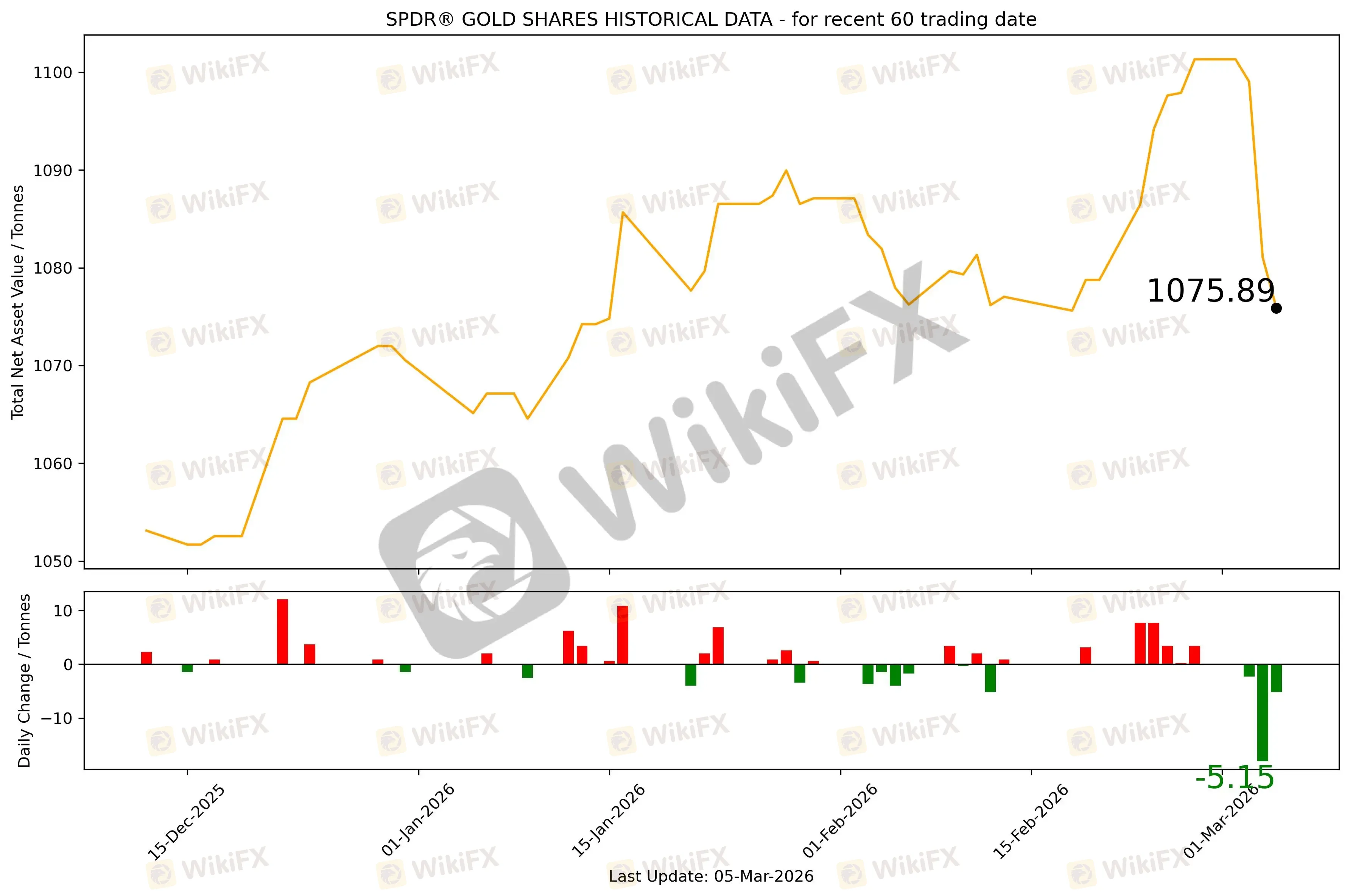 截至2026年03月05日,全球最大的黄金ETF SPDR Gold Trust持仓量为1075.89吨,较上一个交易日减少5.15吨。2026年03月05日现货黄金自5134.86美元/盎司开盘后亚盘交易时间短暂走高,未能突破5200美元关口,触及当日高点5194.953美元/盎司后开启震荡下行行情。美盘交易时间最低向下触及5051.15美元/盎司,而后筑底反弹,最终收于5084.63美元/盎司,跌56.31美元或1.1%。