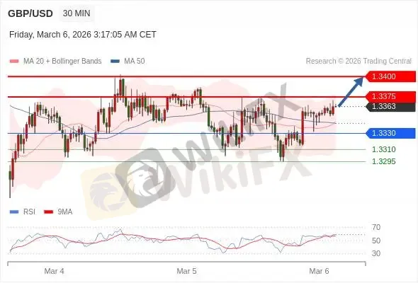 当日内目标为1.3375,看涨,转折点在1.3330。