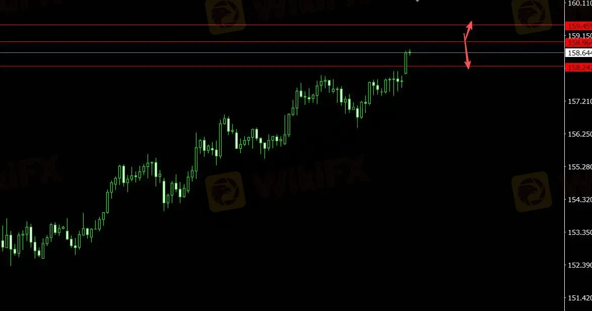 美元指数受支撑,日元上涨,关注支撑位158.240,4小时看多至159.460;关注压力位158.960,4小时看空至157.760。