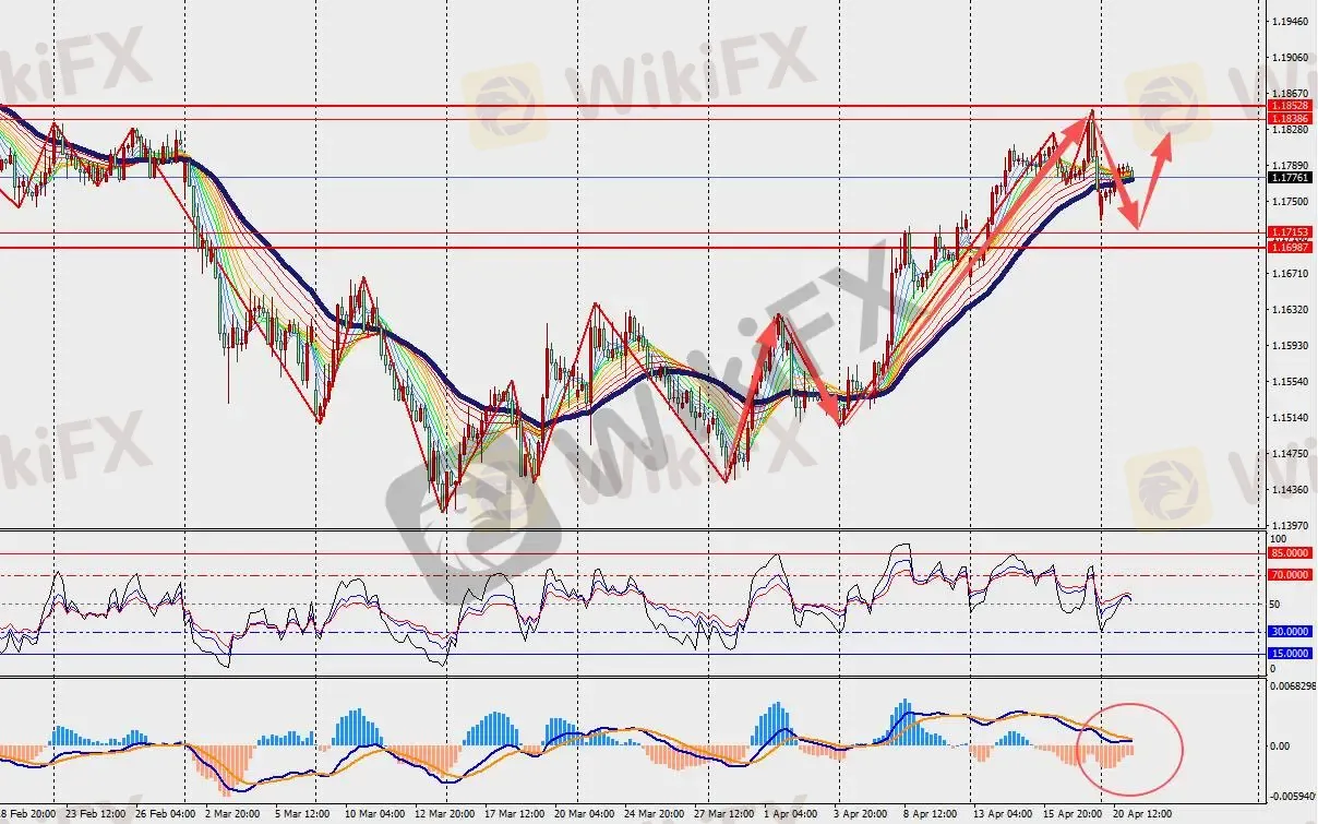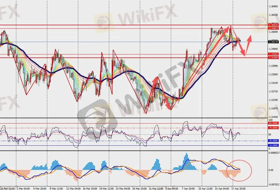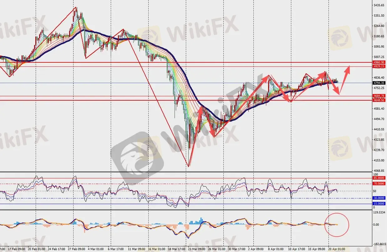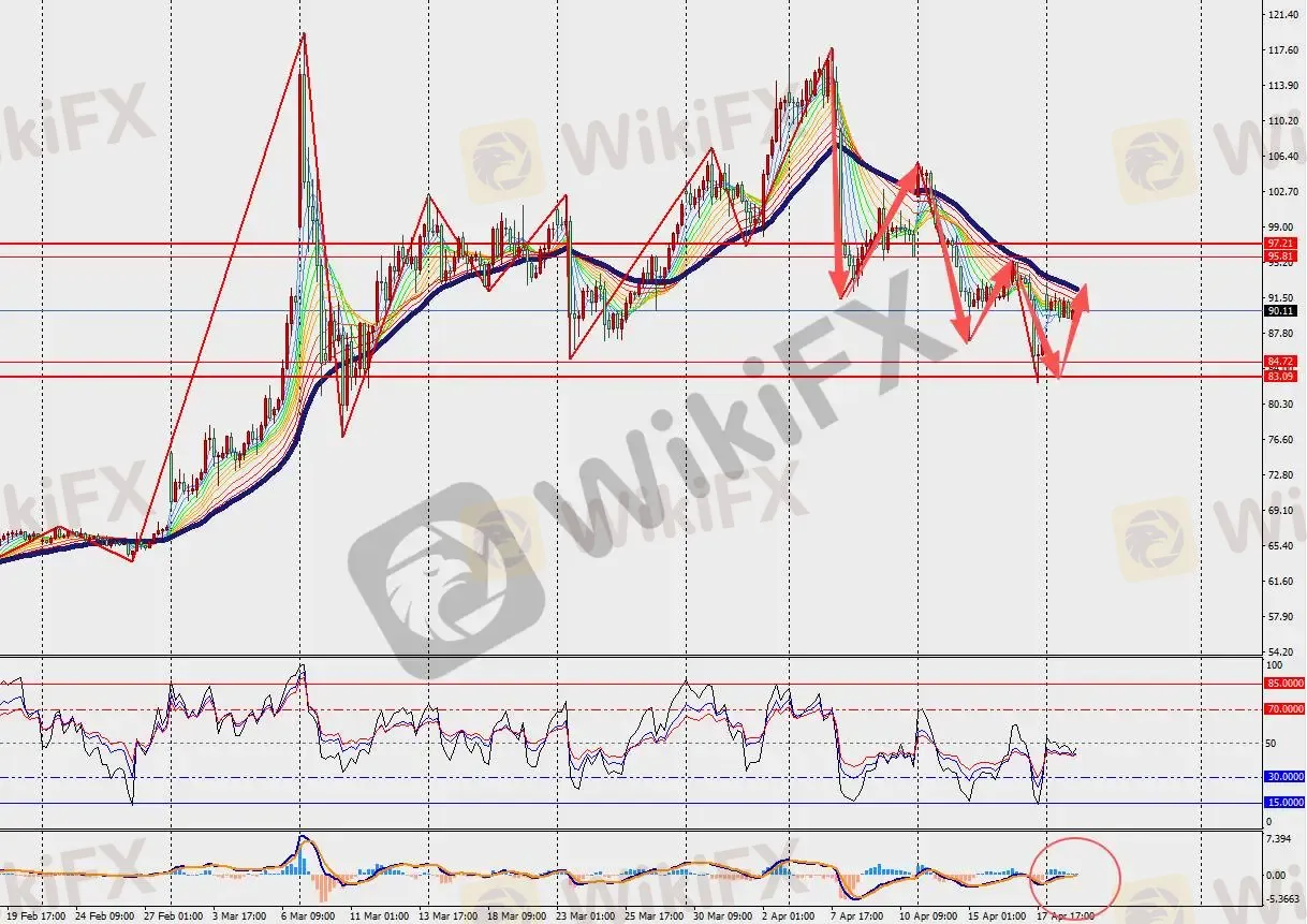 技术面: 欧元兑美元H4级别震荡徘徊,并在48日多空分界线附近运行。此外,MACD双线与量能柱在零轴上方扩张。市场普遍预期,欧洲央行在4月30日政策会议上加息的可能性较低,需进一步观察能源冲击的演变。