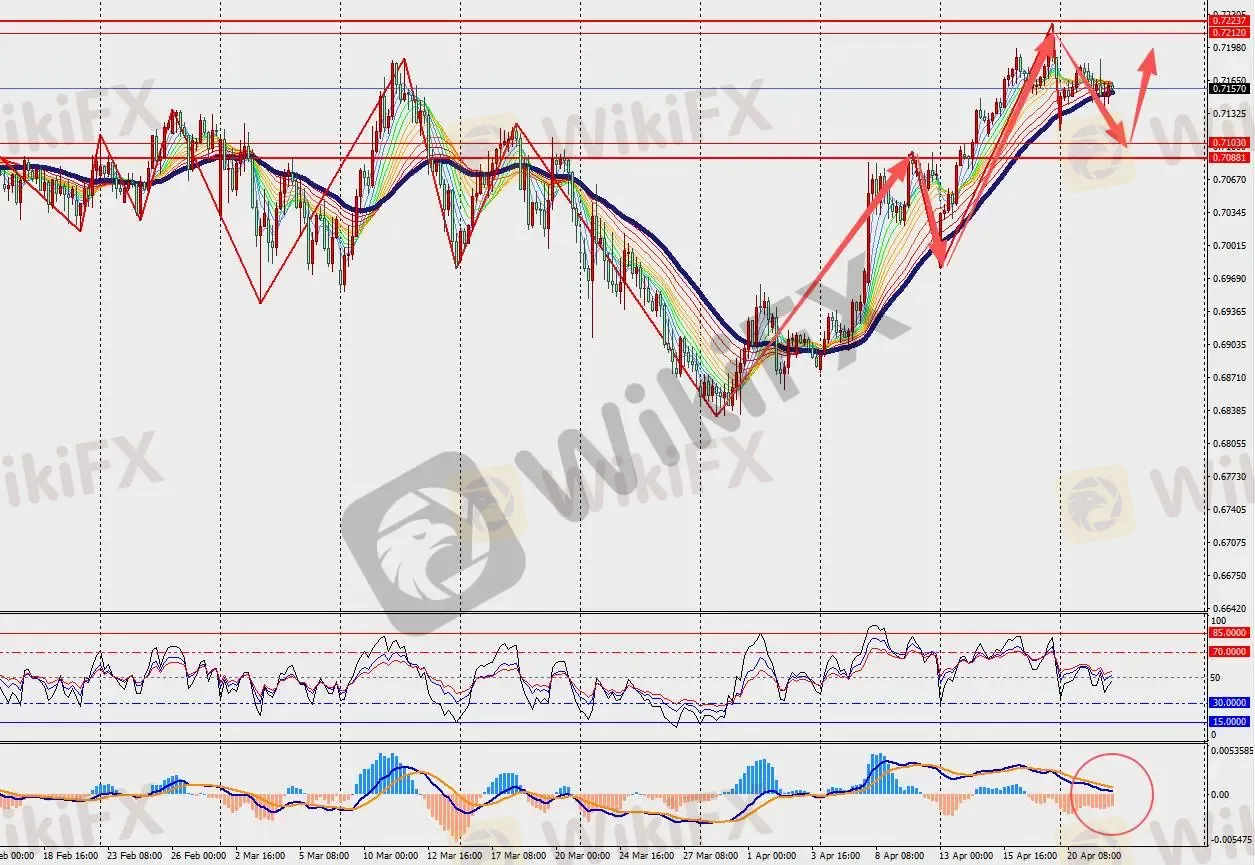 技术面:澳元兑美元H4级别小幅震荡,并在48日多空分界线附近运行。另一方面,MACD双线和量能柱在零轴上方收敛。作为典型的风险敏感货币,澳元通常在市场情绪恶化时表现较弱。