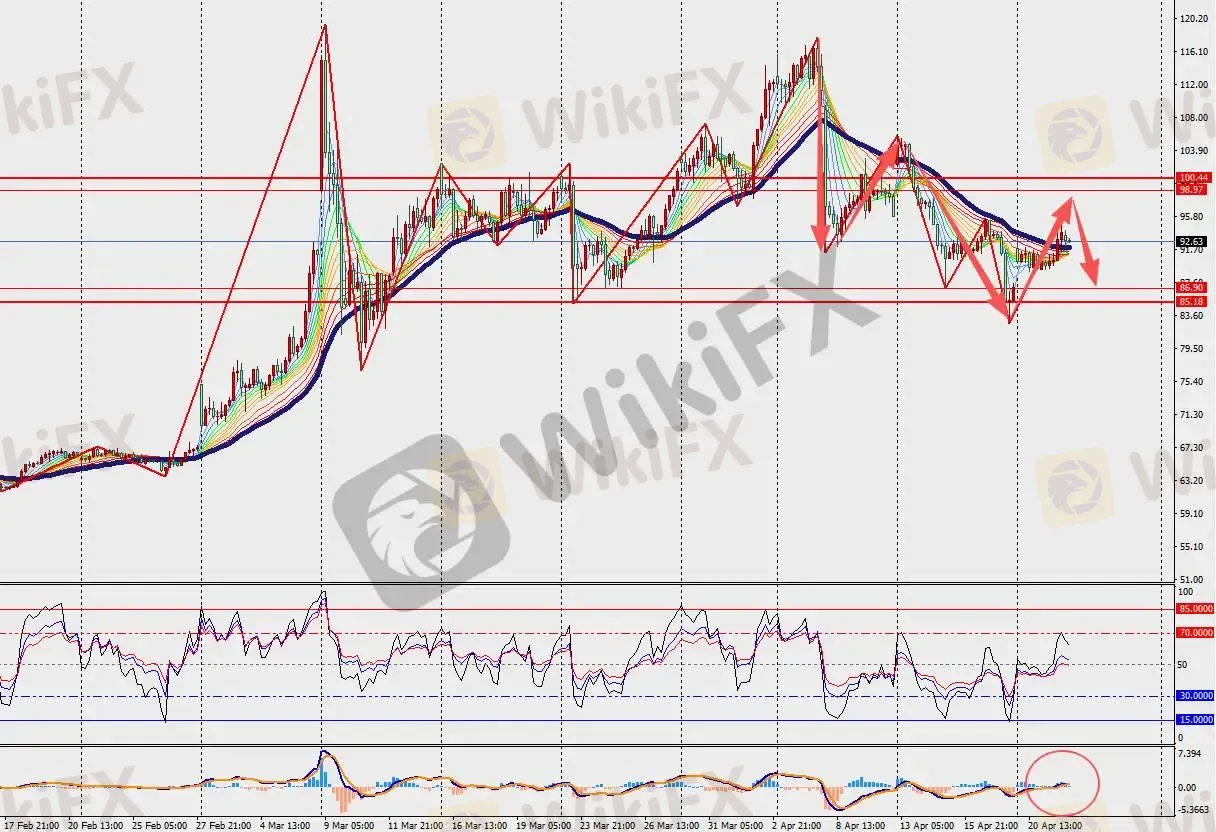 技术面:原油H4级别震荡回落,并在48日多空分界线附近运行。另一方面,MACD双线和量能柱在零轴附近缩量。目前全球石油供应缺口高达900万至1000万桶/日,占比全球总供应的10%左右,全球原油库存将在本月底跌至纪录低点。