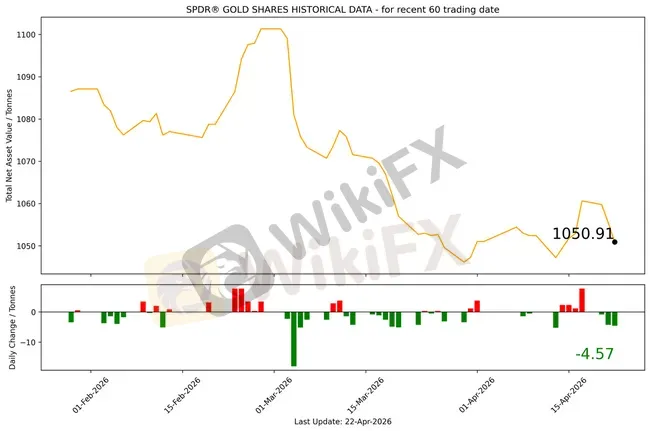 截至2026年04月22日,全球最大的黄金ETF SPDR Gold Trust持仓量为1050.91吨,较上一个交易日减少4.57吨。2026年04月22日现货黄金较前一日有所修复但力度有限。自4723.57美元/盎司开盘后震荡上行,欧盘盘前到达当日高点4772.17美元/盎司,随后反转震荡下跌。最终收于4739.52美元/盎司,涨16.05美元或0.34%。