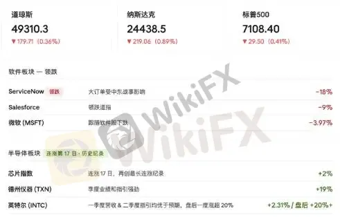 美股当日呈现明显分化:地缘政治紧张(美伊局势)拖累大盘,标普、纳指跌离纪录高位,软件股领跌,ServiceNow暴跌18%、Salesforce跌近9%;中概股整体承压;但半导体板块逆势走强,芯片指数连涨17日创历史纪录,英特尔盘后涨超20%、德州仪器涨19%;大宗商品方面,原油因地缘消息收涨超3%,黄金跌超1%,美元走强,人民币承压。