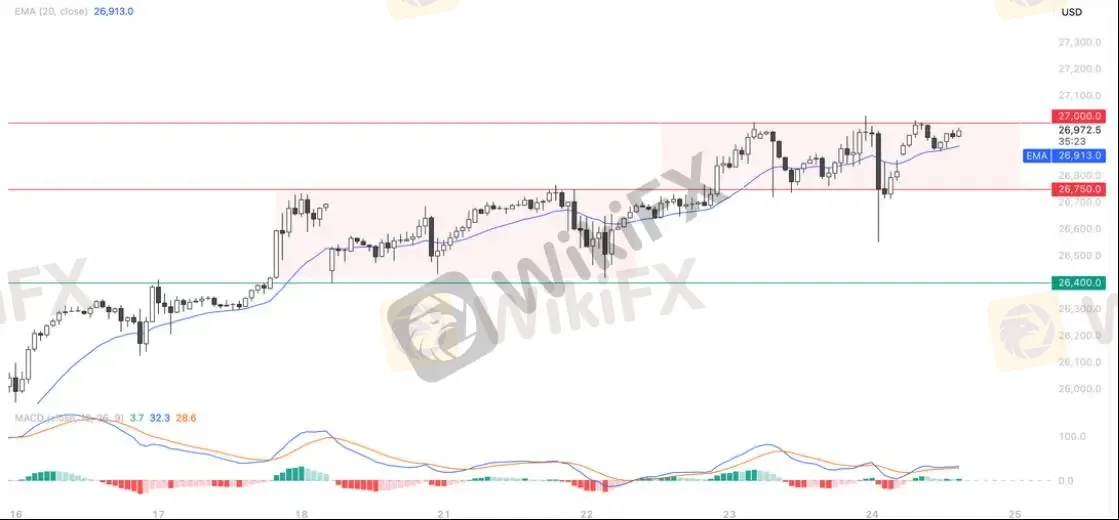 NAS100 当前震荡区间持续上移,多头结构并未被昨日的利空回踩破坏 —— 价格回踩后尾盘快速反弹,直接验证了下方资金承接力度。亚盘时段价格维持在 EMA20 上方高位横盘,短期关键节点明确:上方 27000 是强压力位,若放量突破则打开上行空间;若承压回落,需重点观察下方支撑带的承接表现,警惕区间回踩风险。