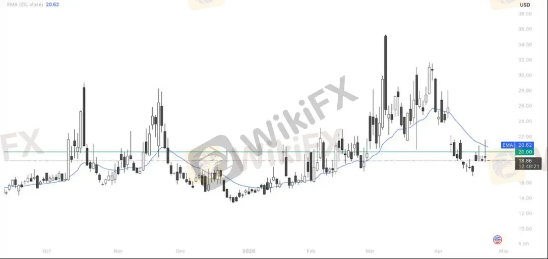 VIX 昨日一度冲高测试 20 美元关键关口,但受 EMA20 均线压制明显,价格冲高后快速回落。从走势结构来看,VIX 未能形成有效突破,反而延续了前期高位回落的趋势,这也侧面印证了市场当前风险偏好仍在,恐慌情绪并未持续发酵。后续重点关注 20 美元关口的二次测试情况,若始终无法站稳,市场风险偏好大概率将维持偏强格局。