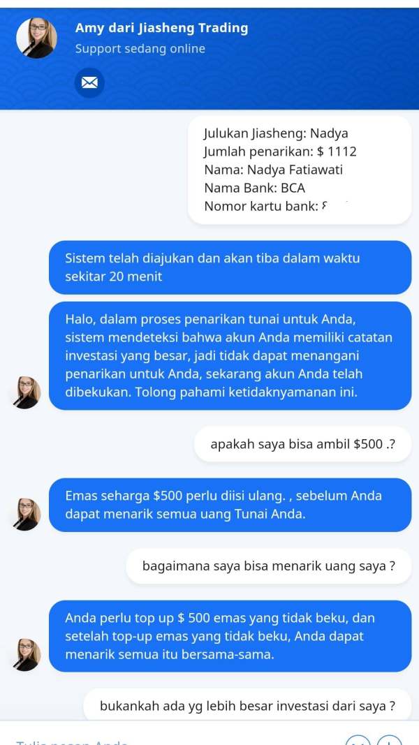 akun saya dibekukan, dan mereka bilang investasi saya terlalu besar dan saya harus top up $500 , untuk bisa menarik uang saya kembali