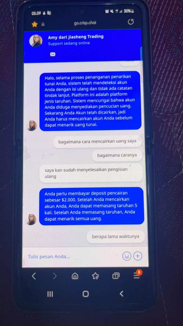 Saya bertemu lelaki cina namanya zhang di tinder , dia menawarkan aku investasi dengan muluk muluk tinggi , dia memaksa saya memasang 2000-3000 dollar namun saya tidak bisa , aku memasukan 5 jt uang saya saat nominal dikit uang saya bisa ditarik , ketika uang saya sudah ratusan juta saya sama skli tidak bisa menarik dengan alasan pembekuan dll !!! Hati hati