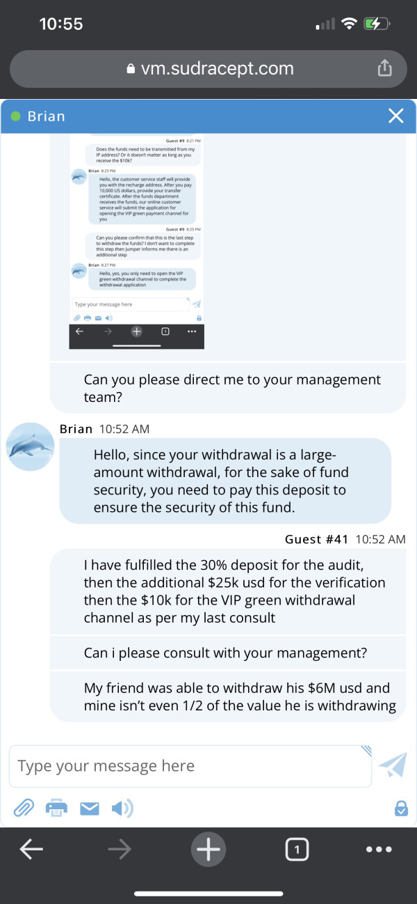 I submitted a withdrawal application to for $625K when I initiated an buy/sell. I received an email stating that the audit couldn't be complete because of the transaction. I was requested to deposit 30% of my profit to verify my identity. So I compiled my funds and deposited. They informed me that I am now required to deposit $10K to open the VIP green withdrawal channel. They confirmed that this would be the last step. Now they request a deposit 3% of withdrawal value. Help please!