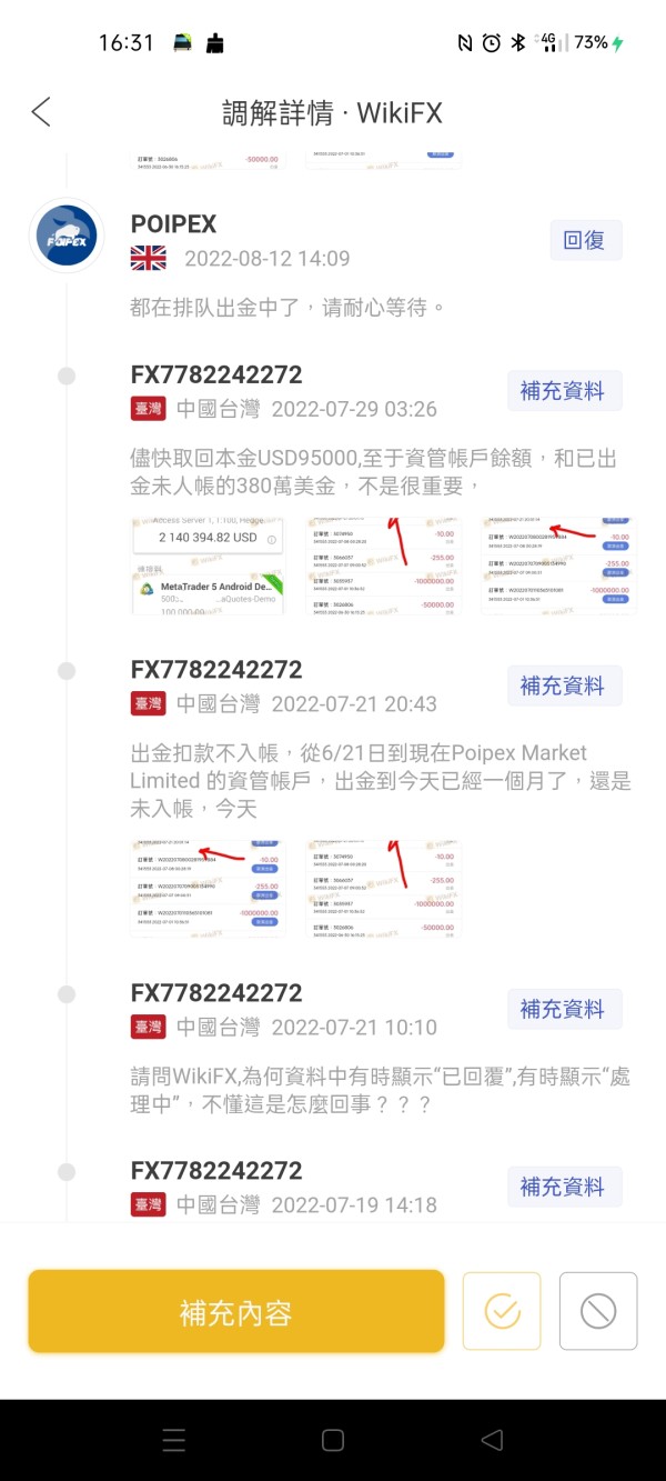 6/21日出金,7/2日投訴,8/12日Poipex 在天眼回覆排隊出金中,今9/16日未入帳,