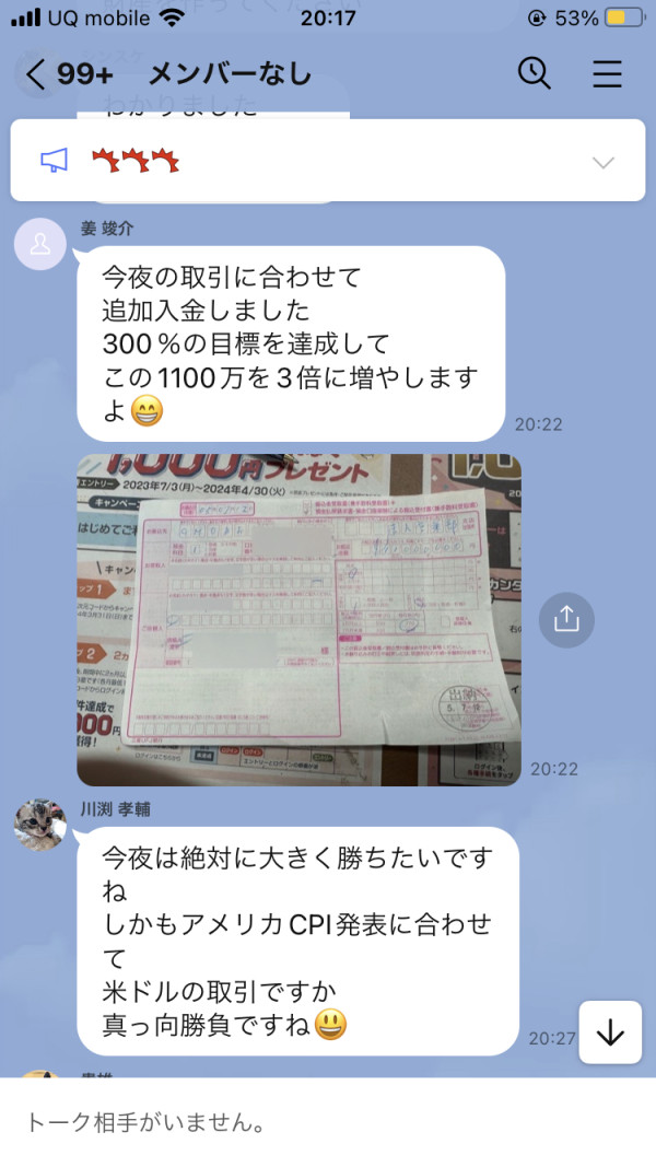 LINEで人を集め、先生と名乗る人たちと沢山のサクラからなるグループ。 グループは『個人投資家の集いB2』みたいな名前が多い。 先生の名乗る人は、別グループと違う名前だが会話や進行状況が全く一緒なので、同一犯と思われる。 最初は株式の話から始まり、徐々にFXへと会話がシフトしていく。 そのうち、オススメの取引所として、ここやここに似た業者を案内される。 案内されたら、ブローカーと名乗る人がサポートと偽って振り込み先を指定してくるが、これこそが詐欺口座。 FX自体は勝てるが、出金ができない。 ここで詐欺だと気付く。時既に遅し。 こういう展開で嵌められていきます。 絶対に振り込まないで下さい!!! 入金を煽ってくる連中がいますが、彼らの写メは全て数字を加工しています!!騙されないで下さい!