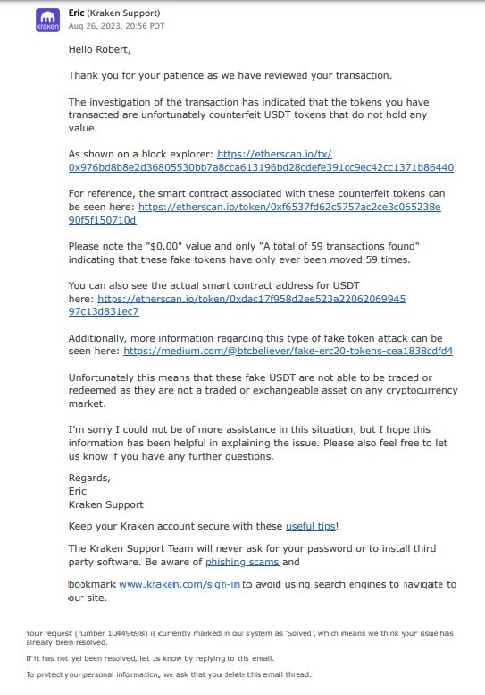 Using all the normal methods of fund transfer found in the coinbase wallet, I attempted to transfer my funds from my coinbase wallet to me Kraken account. Coinbase sent the transfer however karken calims they sent counterfiet coins and send me an email telling me then closed my account. See attachment. Coinbase refused to refund me the original funds and kraken won't even discuss telling me to converse with them only by email which I sent but no answer, it so that now I am without recourse.